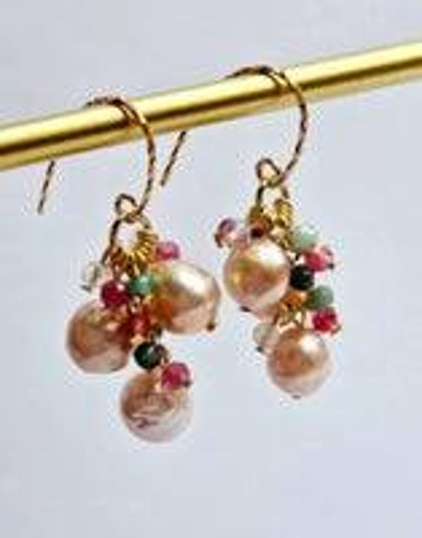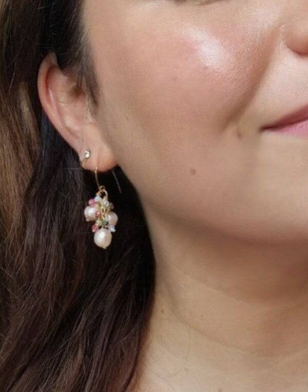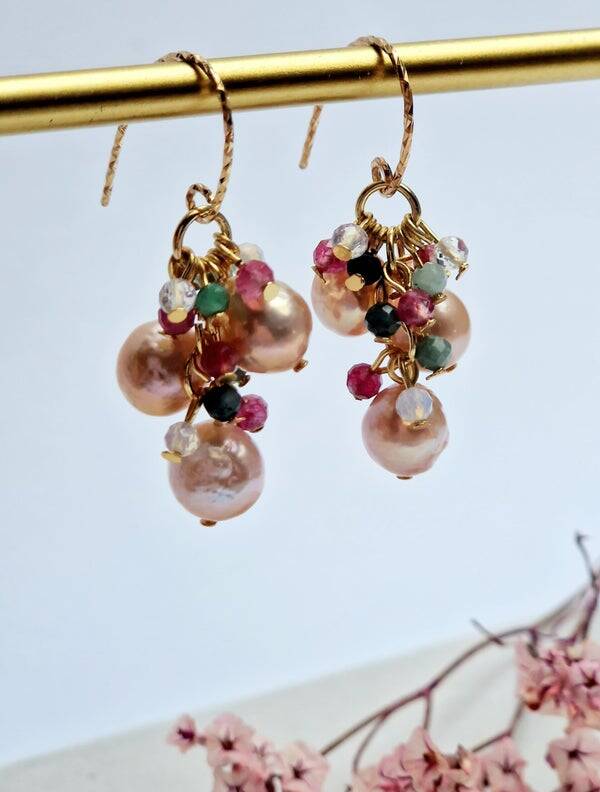 Diese handgefertigten Cluster-Ohrringe aus 925 Sterling Silber vereinen zarte rosa Süßwasserperlen mit edlen Smaragden, rosa Topasen und schimmernden Opalen.