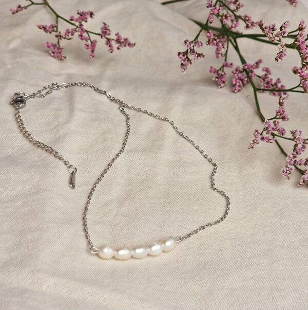 Diese zarte Halskette kombiniert echte Süßwasserperlen mit hochwertigem Premium-Edelstahl in Silber oder Gold.