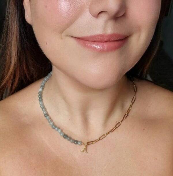 Initialen Halskette mit Burma Jade – 6 mm Naturstein – Edelstahl – 45+5 cm – Gold/Silber