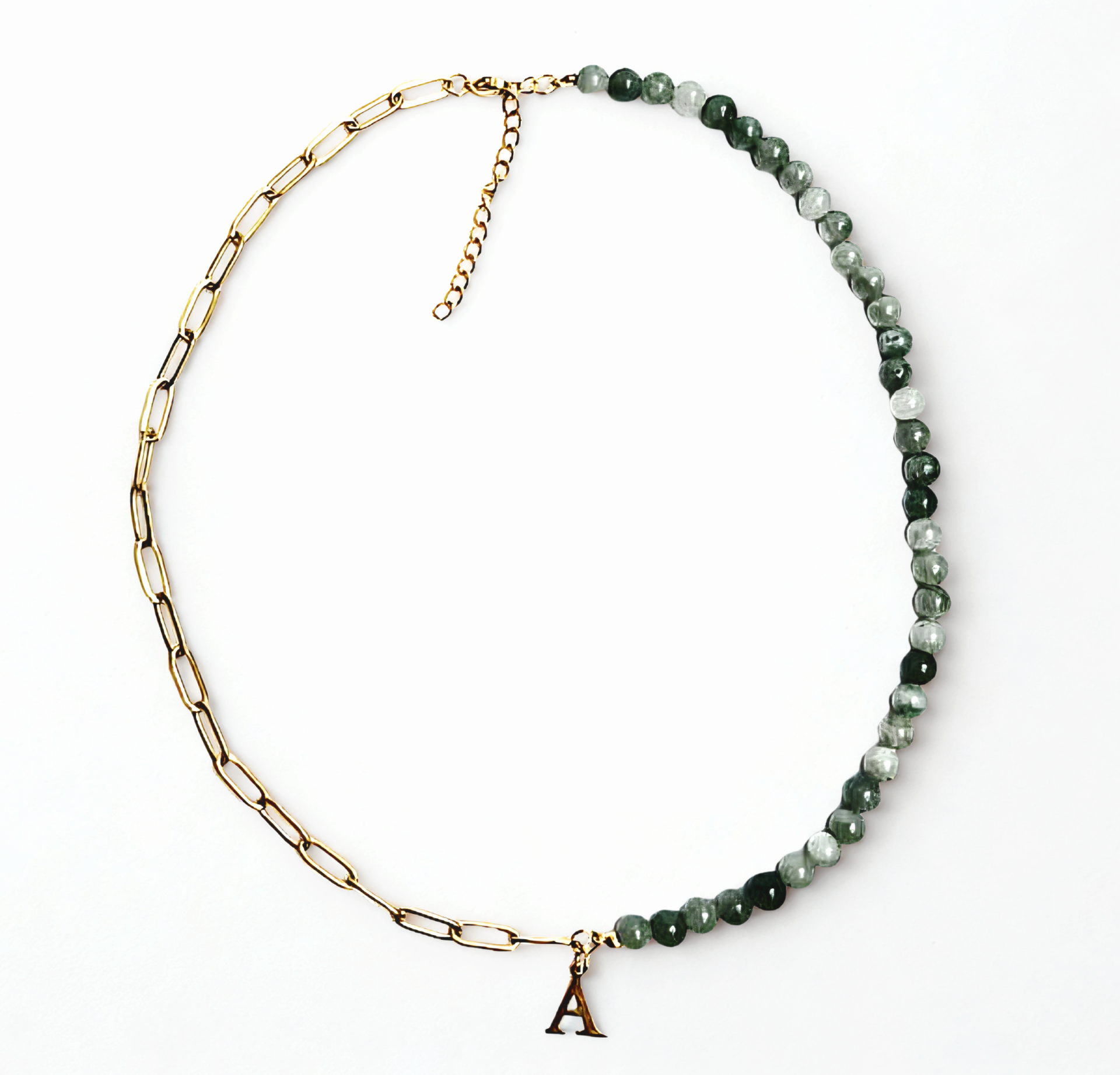Diese elegante Initialen-Halskette verbindet die natürliche Schönheit von Burma Jade (6 mm) mit einer persönlichen Note. Die sanften Grüntöne des Natursteins stehen für Ruhe und Balance, während der Edelstahl-Paperclip-Anhänger Ihre ausgewählte Initiale stilvoll hervorhebt.