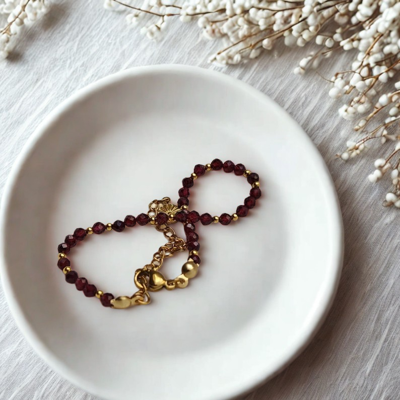 Dieses elegante Armband mit tiefroten Granatsteinen (4 mm) vereint natürliche Stärke mit zeitloser Schönheit. Die facettierten Granatkugeln funkeln dezent bei jeder Bewegung, während die gold- oder silberfarbenen Edelstahlelemente einen luxuriösen Akzent setzen.